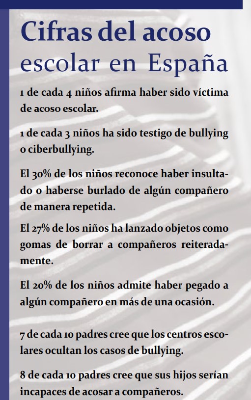 De este estudio se han derivado algunas conclusiones realmente preocupantes sobre la situación del acoso escolar en nuestro país. Entre ellas, se destaca que 4 de cada 10 padres han tenido constancia de la existencia de un caso de bullying o ciberbullying en el centro escolar de sus hijos durante el último año. Si le preguntamos a los niños, casi 1 de cada 4 afirma haber sido víctima de acoso escolar, y 1 de cada tres asegura haber visto directamente o a través de Internet alguna situación de acoso escolar.
