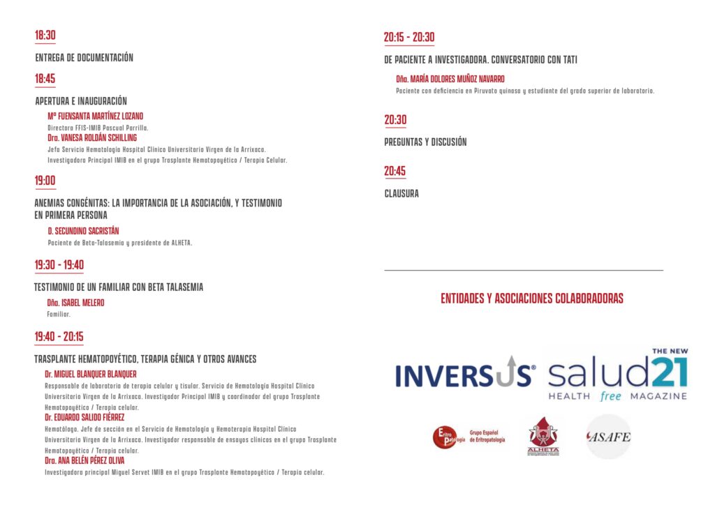 19:00 ANEMIAS CONGÉNITAS: LA IMPORTANCIA DE LA ASOCIACIÓN, Y TESTIMONIO EN PRIMERA PERSONA.