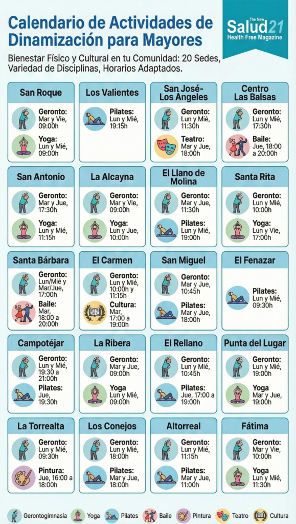 La Concejalía de Bienestar Social renueva este proyecto con una oferta variada de actividades orientadas a fomentar un envejecimiento activo en los mayores de 65 años. Estas actividades se desarrollarán en las 20 asociaciones de mayores del municipio y ascienden a un total de 40 actividades, que van desde la Gerontogimnasia, pilates, yoga, pintura, baileterapia y alfabetización.