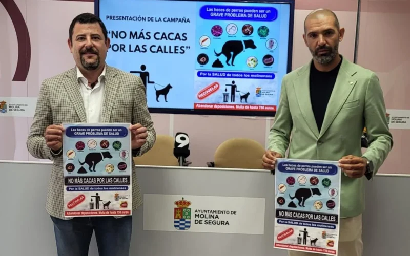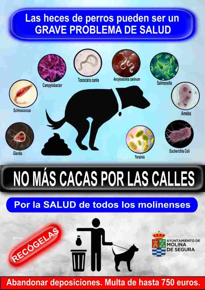 El Ayuntamiento de Molina de Segura, a través de la concejalías de Deporte y Salud y Policía Local, presenta la campaña NO MÁS CACAS POR LA CALLE, con la que trata de concienciar a la ciudadanía del grave problema de salud que pueden suponer las heces de perro y la importancia de recogerlas y limpiar la zona afectada.