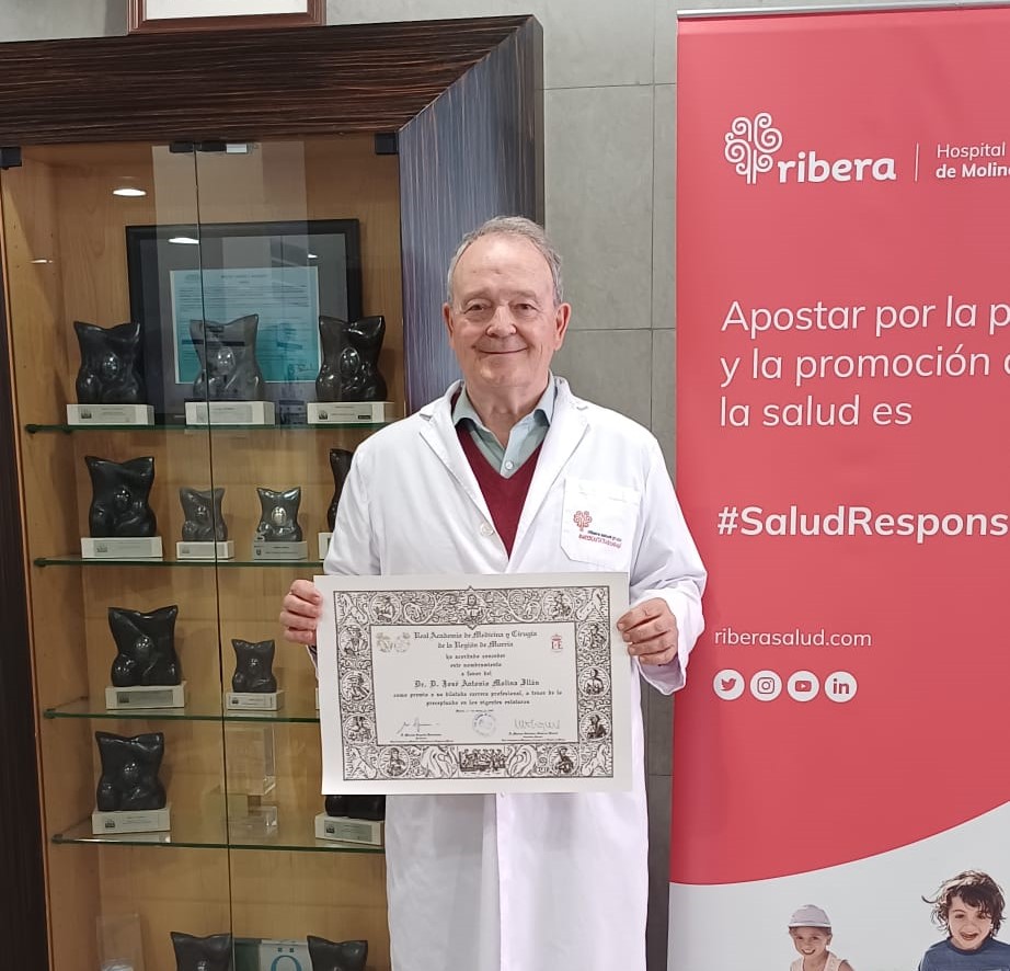 El médico José Antonio Molina Illán, especialista en Medicina Preventiva en Ribera Hospital de Molina, ha recibido un reconocimiento de la Real Academia de Medicina y Cirugía de la Región de Murcia por su carrera profesional, enfocada en la prevención de enfermedades y en mejorar la calidad de la atención sanitaria.